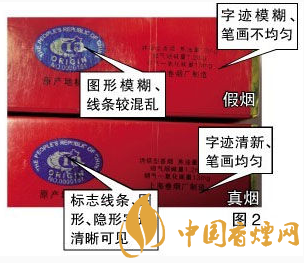 真品“中華”印刷套色準(zhǔn)確,字跡清新、筆畫均勻,字樣邊緣呈細微的齒輪狀,而不是人們普遍認(rèn)為的平滑狀。假煙字跡模糊、筆畫不均勻,字樣邊緣呈平滑狀。真品“中華”原產(chǎn)地標(biāo)志采用中國地圖圖案,細看海南島和臺灣島為空心,在某些角度和光線下圖案背景會呈現(xiàn)“中華”字樣,標(biāo)志線條、圖形、隱形字跡清晰可見。假煙原產(chǎn)地標(biāo)志圖形模糊、線條較混亂。
