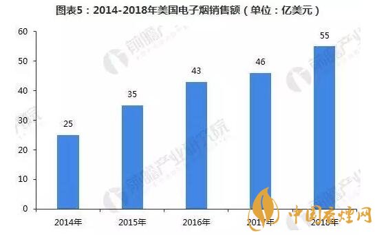 根據(jù)《2017年世界煙草發(fā)展報告》顯示,北美是第一大電子煙市場,而跟據(jù)貝倫貝格銀行發(fā)表的一份報告稱,美國已經(jīng)成為世界上新一代產(chǎn)品銷量最大的市場。2014-2017年,美國電子煙銷售額逐年增長,2017年增長至46億美元。而2017年全球電子煙銷售額約為100億美元,美國就占了近50%的市場份額。預(yù)計2018年美國電子煙銷售額將達到55億美元。