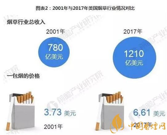 實際上,美國的卷煙銷量下滑了,煙民變少了,但行業(yè)收入?yún)s不斷上升的原因主要是由于美國香煙公司在不斷提升價格。2001年美國香煙平均1包只賣3.73美元,到2016年價格上漲了72.12%,一包香煙要賣6.42美元。但卷煙加價腳步從未停止,2017年9月,美國3家大的卷煙制造商菲莫國際、雷諾茲煙草公司以及帝國品牌公司將每包普通卷煙的價格提升了約0.1美元。今年3月,今年3月,每包普通卷煙的價格再次上漲0.09美元,一包煙的平均價格約為6.61美元。