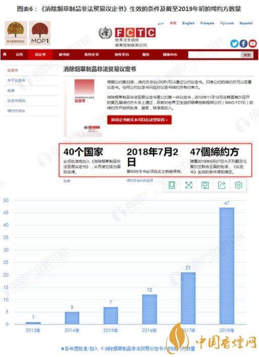 世界衛(wèi)生組織還積極推動(dòng)《消除煙草制品非法貿(mào)易議定書(shū)》簽訂生效。按照2012年通過(guò)該議定書(shū)時(shí)的約定,《議定書(shū)》需要40個(gè)締約方可生效,《議定書(shū)》將在第40份文書(shū)被保存后第90天起生效。根據(jù)世界衛(wèi)生組織煙草控制框架公約發(fā)布的情況,隨著2018年6月27日大不列顛及北愛(ài)爾蘭聯(lián)合王國(guó)的批準(zhǔn),《議定書(shū)》生效的條件得到滿(mǎn)足。目前,議定書(shū)締約方數(shù)量已經(jīng)達(dá)到47個(gè)。