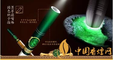 取出煙支,碧玉通透,上有祥云狀龍騰圖標和金色翡翠字樣,近煙端為金色“EMERALD”字母和回形紋環(huán)繞,輔之于中空中支過濾嘴棒及獨創(chuàng)功能性載香卷煙紙,集外觀與功能于一身。