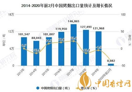 據(jù)中國海關(guān)總署數(shù)據(jù)顯示,2019年全年中國烤煙出口量達到了121968噸,累計下降4.3%。截止至2020年1-2月中國烤煙出口量達到8082噸,相比上年同期減少了4556噸,累計下降36.1%。