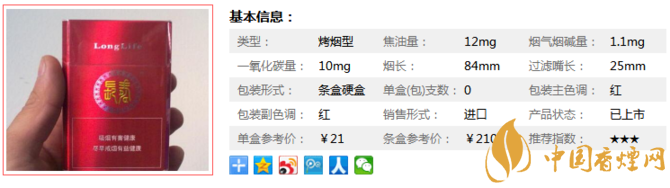 長(zhǎng)壽香煙紅的售價(jià)為21元/包,特別的烤煙味道,它和國(guó)內(nèi)的這些21元檔的香煙完全不是一個(gè)概念。