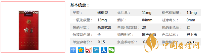 | 類型 :烤煙型 | 焦油量 :11mg | 煙氣煙堿量 :1.1mg | 一氧化碳量 :13mg |