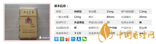 | 類型 :烤煙型 | 焦油量 :11mg | 煙氣煙堿量 :1.2mg | 一氧化碳量 :12mg |