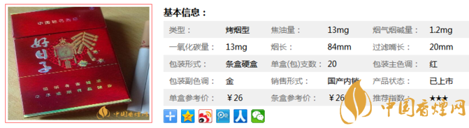 國(guó)內(nèi)第一款采用三元復(fù)合生物濾嘴的卷煙,利用分子篩專(zhuān)利技術(shù)吸附煙氣中一氧化碳、亞硝胺等,顯著降低煙氣中的有害成分,比較好地保護(hù)喉部、肺部和人體內(nèi)環(huán)境。下面我們一起來(lái)看雙喜硬金樽好日子的參數(shù)信息:焦油量:13mg 煙堿量:1.2mg 一氧化碳量:13mg。