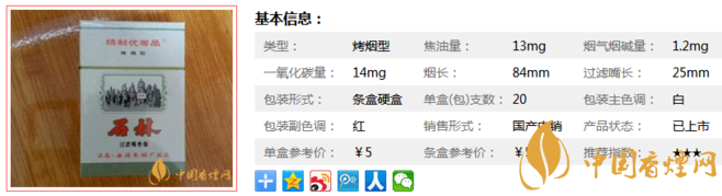 石林白香煙煙長84mm,過濾嘴長25mm,采用高難度的凸、平燙結(jié)合的燙金技術(shù);多工序膠凹印相結(jié)合,增加了商標的制作難度;采用了具有較強防偽功能的潛影壓紋新技術(shù),從不同方向看,可見“石林”和“STONE FOREST”英文。下面我們一起來看石林白的參數(shù)信息:焦油量:13mg 煙堿量:1.2mg 一氧化碳量:14mg.