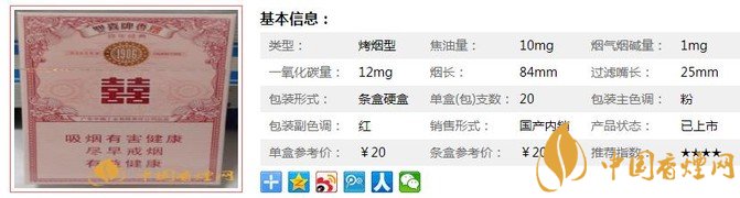 輔材設(shè)計(jì)上,選用各種新型卷煙材料,在確保卷煙品質(zhì)風(fēng)格的前提下達(dá)到了降焦減害的目的。采用了高品質(zhì)、低焦油、低危害的再造煙葉有機(jī)地融合到葉組配方中,發(fā)揮了再造煙葉降焦減害和特色增香的特殊功效。下面我們一起來(lái)看雙喜百年經(jīng)典的參數(shù)信息:焦油量:10mg. 煙堿量:1mg. 一氧化碳量:12mg.