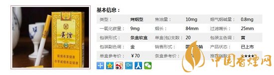 | 類型 :烤煙型 | 焦油量 :9mg | 煙氣煙堿量 :0.9mg | 一氧化碳量 :10mg |