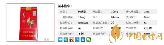 | 類型 :烤煙型 | 焦油量 :10mg | 煙氣煙堿量 :1mg | 一氧化碳量 :11mg |