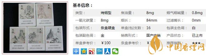 | 類型 :烤煙型 | 焦油量 :8mg | 煙氣煙堿量 :0.8mg | 一氧化碳量 :8mg |