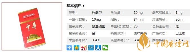 中華硬10mg話梅香味濃郁可口,聞味就好像蜜制的話梅,香氣雖然濃郁但要比硬中稍微清淡一些。此煙味道淳柔,柔中帶剛,不管你是老煙槍還是喜歡味淡的煙民,此煙都適合。入口后,沒有異味,這點(diǎn)十分難得。經(jīng)香煙網(wǎng)小編市場(chǎng)調(diào)查中華硬10mg售價(jià)為43元/包。