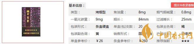 | 煙長(zhǎng):84mm | 過(guò)濾嘴長(zhǎng):25mm | 包裝形式:條盒硬盒 | 單盒(包)支數(shù):20 |