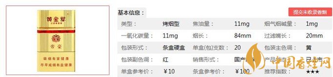 | 類型 :烤煙型 | 焦油量 :10mg | 煙氣煙堿量 :1mg | 一氧化碳量 :10mg |