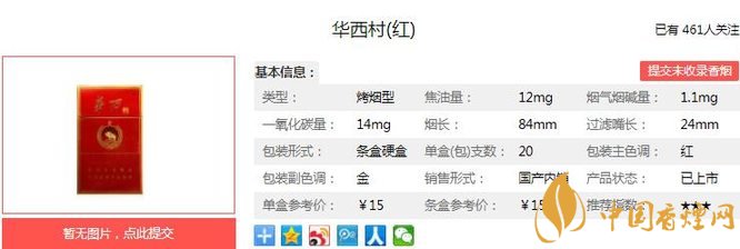 華西村紅傳承了蘇系香煙的特點,以煙氣細膩柔和中,充滿著平和的醇厚感,征服了大量和煙客。在中國華西村香煙價格表圖中它們銷量好,口碑也非常不錯。經香煙網小編市場調查華西村紅售價為15元/包。