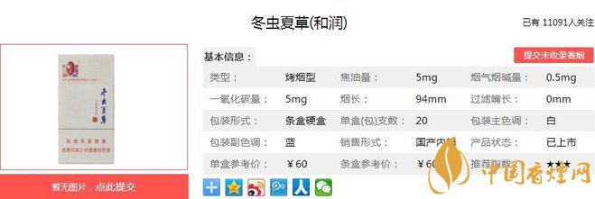 冬蟲夏草(和潤)煙支長:97mm,烤煙型,包裝形式:條盒硬盒(每盒 20支,每條 10 盒)。煙嘴長:5mm。用云南優(yōu)質(zhì)煙葉為主料,配以福建、貴州等地的上等煙葉,經(jīng)過嚴格的原料挑選、精細加工,使煙絲色澤油潤光鮮。下面我們一起來看冬蟲夏草(和潤)的參數(shù)信息:焦油量:5mg 煙堿量:0.5mg 一氧化碳量5mg