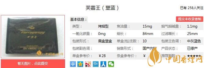 芙蓉王(塑藍(lán))煙支長(zhǎng):84mm,烤煙型,包裝形式:條盒塑盒(每盒 10 支,每條 10 盒)。傳統(tǒng)配方與現(xiàn)代科學(xué)配方技術(shù)完美結(jié)合的典范。包裝華貴典雅,盡顯王者之氣。下面我們一起來(lái)看芙蓉王(塑藍(lán))的參數(shù)信息:焦油量:15mg 煙堿量:1.1mg