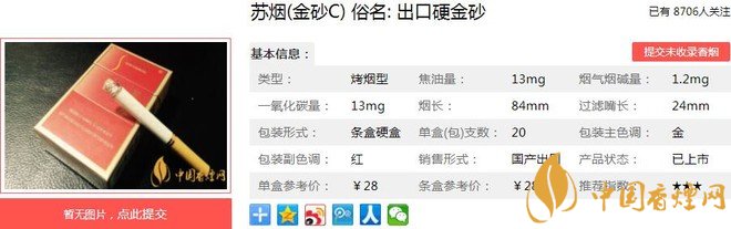 蘇煙(軟金砂C)俗名: 出口硬金砂,外觀包裝設(shè)計(jì)體現(xiàn)了時代感和高雅、華貴、時尚、氣派的風(fēng)格。煙絲金黃油潤,賞心悅目,香氣高雅充足,煙氣柔和豐滿,吃味舒適干凈,形成了“江蘇第一煙”柔、香、雅獨(dú)特風(fēng)格。經(jīng)香煙網(wǎng)小編市場調(diào)查蘇煙軟金砂C售價為28元/包。