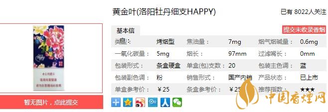 洛陽(yáng)牡丹happy系列突出煙草自然本香,在傳承黃金葉風(fēng)格特點(diǎn)的同時(shí),更具有別樣的香氣特征,香氣優(yōu)雅飄逸,煙氣細(xì)膩柔和,吃味生津回甜,余味干凈舒適。經(jīng)香煙網(wǎng)小編市場(chǎng)調(diào)查黃金葉洛陽(yáng)牡丹細(xì)支HAPPY售價(jià)為25元/包。