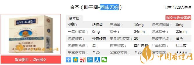 以上便是由香煙網(wǎng)小編為大家介紹的關(guān)于金圣(滕王閣·回味無窮)多少錢一包 回味無窮口感及參數(shù)介紹的相關(guān)信息,想要了解更多有關(guān)內(nèi)容請點擊:阿里山香煙好抽嗎 六款阿里山香煙口感分析