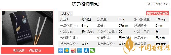 嬌子格調(diào)細(xì)支以涼山煙葉為主體,涼山煙區(qū)地處世界優(yōu)質(zhì)煙葉黃金走廊,倚四季冰川澤萬(wàn)頃桑田,立體的生態(tài)氣候,獨(dú)特的山地地貌鑄就了涼山煙葉協(xié)調(diào)飄逸的香氣,醇和優(yōu)雅的吃味。穩(wěn)定、過(guò)硬的質(zhì)量品質(zhì)使它最終獲得消費(fèi)者認(rèn)可。經(jīng)香煙網(wǎng)小編市場(chǎng)調(diào)查嬌子格調(diào)細(xì)支售價(jià)為15元/包。