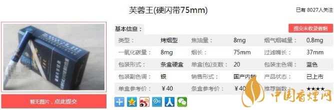 | 類型 :烤煙型 | 焦油量 :8mg | 煙氣煙堿量 :0.8mg | 一氧化碳量 :12mg |