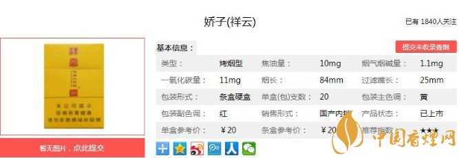 以上便是香煙網(wǎng)小編為大家介紹的關(guān)于祥云嬌子多少錢一包,祥云嬌子價(jià)格20元一包的相關(guān)信息,看完之后大家是不是對于嬌子(祥云)這款香煙的相關(guān)信息更加了解呢。大家還想查詢更多的相關(guān)內(nèi)容歡迎點(diǎn)擊:嬌子寬窄平安價(jià)格30元一包,傳承寬窄系列的口感!
