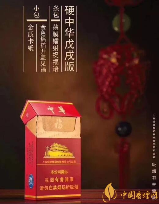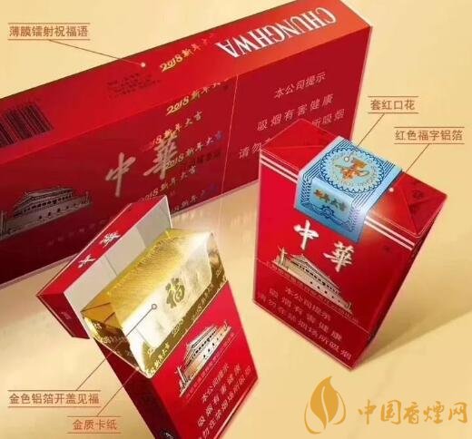 而轉包中華2018新年大吉香煙中華戊戌版,整條薄膜印刷有2018大吉字樣祝福語,小包口花處有新年大吉和金色LOGO,大紅色的福字鋁箔。香煙全部為“3”字頭。