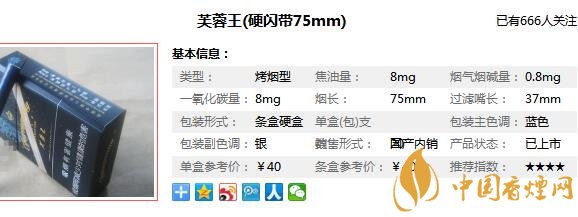 以上內(nèi)容是由香煙網(wǎng)小編收集以及整理的關于,芙蓉王硬閃帶75mm多少錢一包以及芙蓉王硬閃帶75mm價格相關的信息,想要了解更多相關信息請點擊:芙蓉王爆珠煙多少錢。