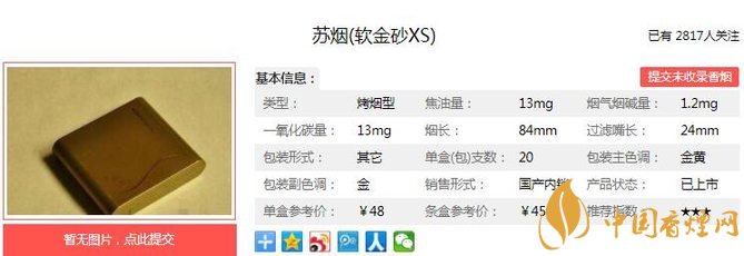 利群夜西湖煙支長84mm,過濾嘴長24mm,從外到內(nèi)在質(zhì)量都力求卓越,精工制作,追求高質(zhì)量、高檔次、高品味。下面我們一起來看蘇煙軟金砂XS的參數(shù)信息:焦油量:13mg 煙堿量:1.2mg 一氧化碳量:13mg