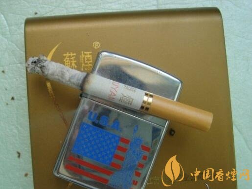 暗金色塑盒包裝,主體為方形,上下兩側(cè)作弧形處理,給人以輕巧圓潤之感。正面左側(cè)一道極似女人身體曲線的“S”形劃過,旁邊有繁寫的“蘇煙”二字,右下方是“江蘇中煙工業(yè)公司出品”,設(shè)計簡約,表意婉約。背面標有商品的基本信息(包括三項理化指標、條形碼等)和警示語。其余四面皆無文字或圖案。