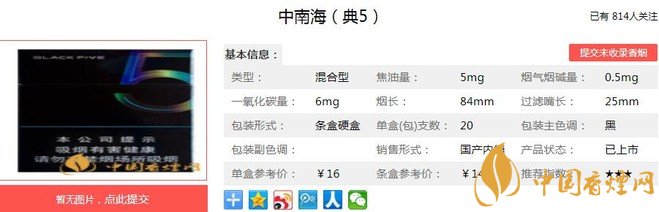 整體設(shè)計(jì)大面積黑色留空,靈動(dòng)絢麗的數(shù)字“5”設(shè)計(jì),給大面積的黑色注入活力,避免色彩的單調(diào),以極簡的方式,給人以更多的想象空間。其煙氣柔和細(xì)膩,香氣飽滿,余味干凈,且混合型特點(diǎn)更加突出。經(jīng)香煙網(wǎng)小編市場調(diào)查中南海典5售價(jià)為16元/包。