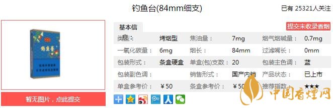 釣魚臺84mm細(xì)支煙支長84mm,過濾嘴長25mm,比普通的細(xì)支香煙要短了不少,小巧精致,拿在手里十分精致,煙絲填充飽滿,做工細(xì)致。下面我們一起來看釣魚臺84mm細(xì)支的參數(shù)信息:焦油量:7mg 煙堿量:0.7mg 一氧化碳量:6mg