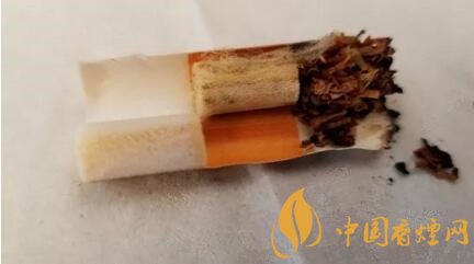 煙絲從外觀上檢視,由棕黃和明黃煙絲組成,品級(jí)不錯(cuò)。煙絲切寬1mm左右。間雜切成細(xì)小圓片裝的煙梗。用料還是比較考究的。