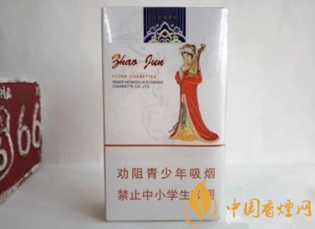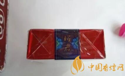 煙盒頂部有藍(lán)色條紋的封簽紙,上面寫著昭君二字,旁邊是一些特色花紋點(diǎn)綴。底部就簡單了,大青山的logo,山還是用象形字表示的。