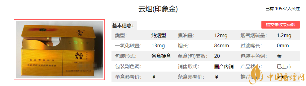 | 類型 :烤煙型 | 焦油量 :10mg | 煙氣煙堿量 :1mg | 一氧化碳量 :10mg |