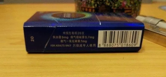 555香煙雙冰三項理化指標分別為:焦油含量9毫克,煙堿量也就是尼古丁含量為0.7毫克,一氧化碳7毫克。另一側寫標注了它的身份信息,中煙英美授權,印尼產(chǎn),國際條形碼為888開頭,為555亞洲品牌注冊地,也是英美的亞洲總部新加坡。