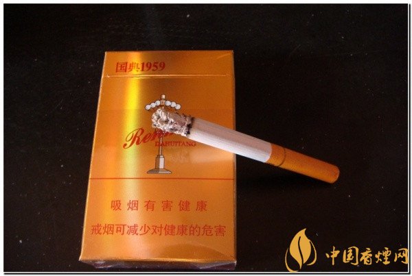 打開煙盒,首先看到的是錫紙上國典1959字樣??拷宦劊η逅臒煵菹?,帶點涼清酸爽的氣味。手捏煙支,感覺充實,煙絲的色澤鮮艷。過濾嘴是金黃色的,上有““人民大會堂”的字樣。過濾嘴裙帶處有一道白金色的金箍,金箍下是“國典1959”字體。