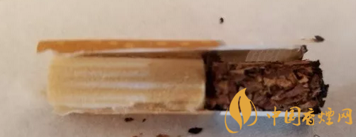 剖開(kāi)歐免The King濾嘴,是經(jīng)典的一段式醋酸纖維絲束濾嘴段。從絲束的顏色變化,很容易看到降焦孔開(kāi)在了絲束的前1/3位置,顏色變化均勻。降焦孔后,每個(gè)孔位置,有條帶狀的顏色加深,是空氣介入流動(dòng)所致。從煙絲外觀看,煙葉的品級(jí)非常好,用料實(shí)。攤開(kāi)煙絲,看到的是明黃、棕黃的烤煙煙絲比例較大,間雜有比例稍小的深棕色的晾煙煙絲,未見(jiàn)涂布制絲和膨脹制絲。里面混雜與切成薄片狀的煙梗。#p#副標(biāo)題#e#