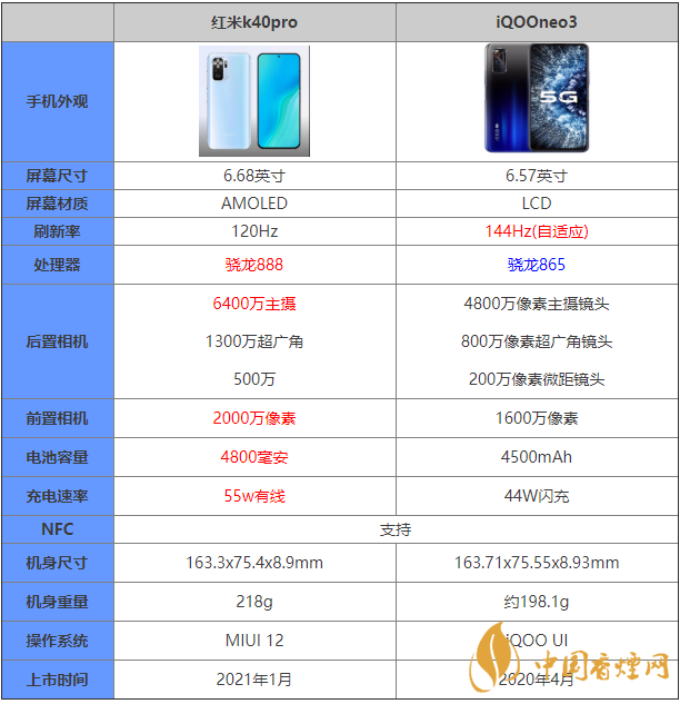 紅米k40pro這款手機(jī)可將會是最為便宜的驍龍888手機(jī),那么這款手機(jī)和iQOOneo3相比較的話到底是誰占有著更加優(yōu)秀的性能表現(xiàn),哪款手機(jī)更值得入手?下面香煙網(wǎng)小編將為大家介紹這兩款手機(jī)的參數(shù)對比情況,感興趣的朋友一起來看看吧!