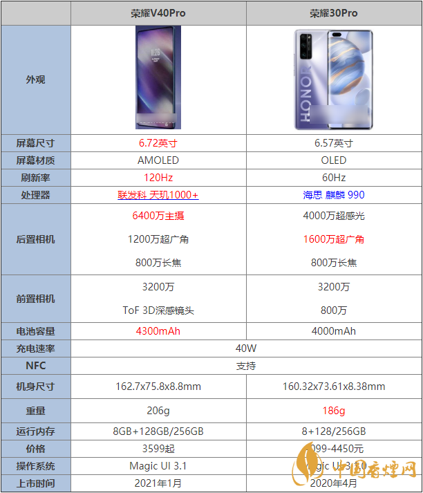 榮耀V40Pro?和榮耀30Pro?:都支持40W有線快充的基礎上,榮耀V40Pro?的4200mAh電池容量更大,為用戶使用帶來更好的電量保障。