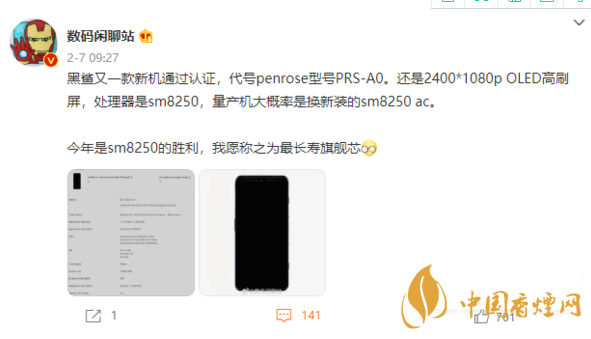 “黑鯊又一款新機通過認(rèn)證,代號penrose型號PRS-A0。還是2400*1080p OLED高刷屏,處理器是sm8250,量產(chǎn)機大概率是換新裝的sm8250 ac。”