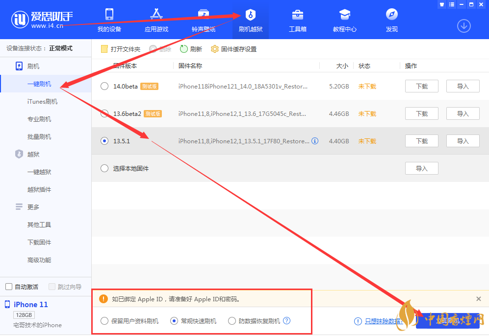 3.確認數(shù)據(jù)備份成功之后,點擊上方“刷機越獄”進入到“一鍵刷機”界面,選擇 iOS 13.5.1,勾選“常規(guī)快速刷機”,然后點“立即刷機”,之后愛思助手會自動幫您下載固件并刷機。
