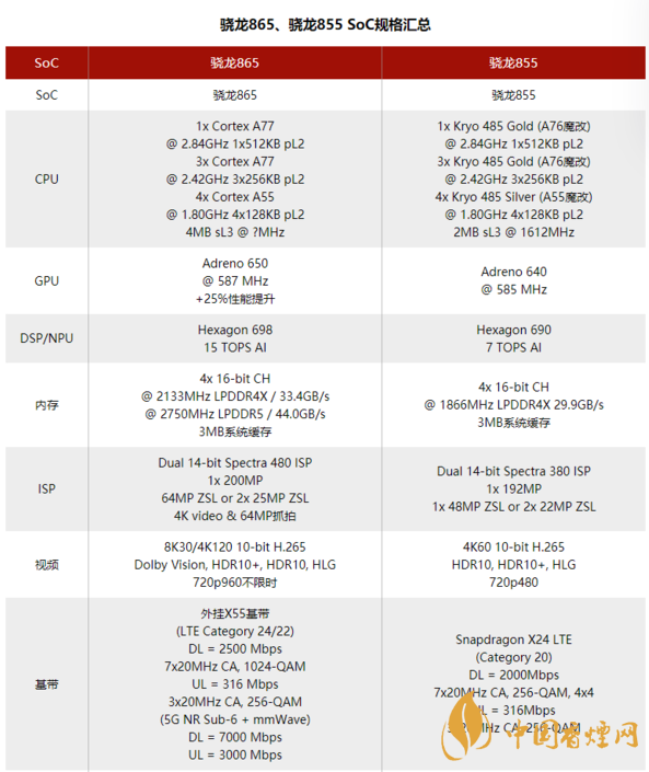 更為重大的升級(jí)之一應(yīng)該是支持LPDDR5內(nèi)存。驍龍865處理器集成了新的LPDDR5和LPDDR4X內(nèi)存控制器,LPDDR5內(nèi)存能夠帶來(lái)更高的內(nèi)存速度以及更高的帶寬,以及功耗也會(huì)得到相應(yīng)的提升。但是新的內(nèi)存的延遲應(yīng)該是一樣的。驍龍865處理器以及驍龍855處理器的技術(shù)規(guī)格如下表: