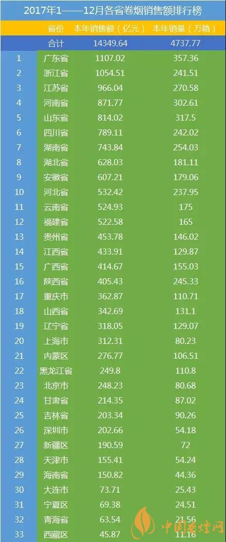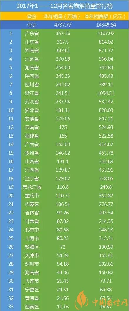 以上就是香煙網(wǎng)小編為大家整理介紹的關(guān)于中國香煙銷量排行榜前三十名以及2017各省香煙銷售額排行榜。更多了解點擊:2017銷量最好的煙是什么 重點品牌香煙銷量排行榜表2017前10名