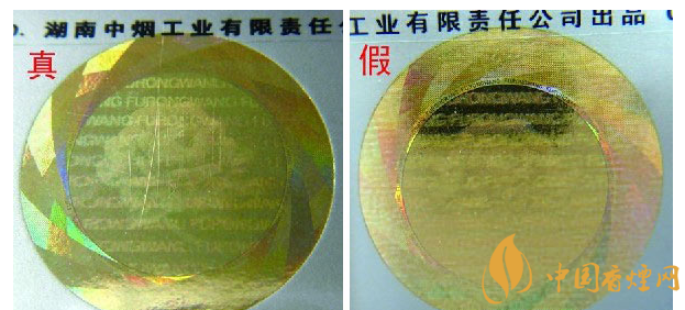 ②迎光觀察激光全息圖案:真品卷煙圖案內(nèi)拼音字母、芙蓉花及“芙蓉王”轉(zhuǎn)換不同角度,都會呈現(xiàn)不同圖案的切換,且層次清晰、字體完整;假冒卷煙無論如何轉(zhuǎn)換角度,都無法達到完美切換,字體模糊,圖案缺失嚴(yán)重。