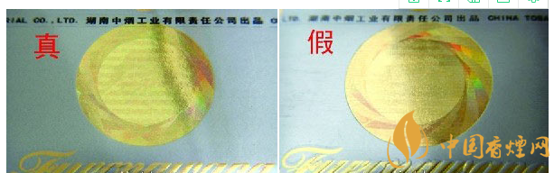 ①平放在桌上,斜角45度觀察靜止?fàn)顟B(tài)下的激光全息圖案:真品卷煙圖案表面燙金平整、干凈,能照射出影像來,且無任何污垢痕跡;假冒卷煙表面印刷粗糙,能明顯看出表面定位燙金有脫皮現(xiàn)象,污垢痕跡明顯,表面如同銅鏡上附著一層霧氣看上去較模糊不清。
