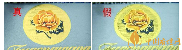 ②正面芙蓉花及拼音字母印刷:真品卷煙燙金顏色均勻一致,色差小,圖案中橫條線之間線條粗細(xì)大小相同,且表面干凈、整潔;假冒卷煙燙金套印偏差大,邊緣多出現(xiàn)凹凸不平現(xiàn)象,圖案中橫條線之間大小不一,色差較大。