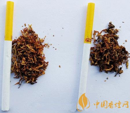 真煙煙支黃色接裝紙長(zhǎng)度為30mm,煙絲切絲寬度均勻,煙絲疏松、光澤油潤(rùn)性好,呈檸檬黃色,煙絲結(jié)構(gòu)為葉絲和少量造紙法再造煙葉;假煙煙支黃色接裝紙較長(zhǎng)為32mm,煙絲切絲寬度不勻,光澤油潤(rùn)性較差,煙絲結(jié)構(gòu)為葉絲和膨脹梗絲,與真品特征存在明顯差異。