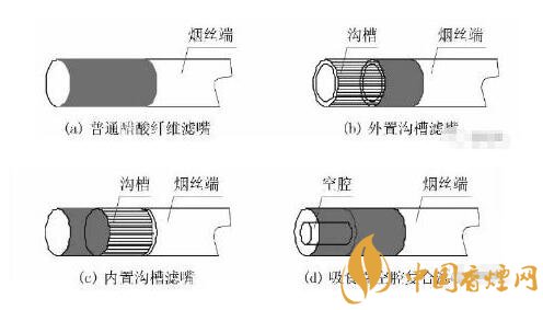 溝槽濾嘴:是一種由于特殊結(jié)構(gòu)的溝槽純纖維紙包囊醋酸纖維絲束濾芯制成。簡單來說,就是在醋酸濾芯的外圍先包覆一層溝槽纖維素紙,然后包裹一層成形紙而成。溝槽纖維素紙的表面是通長的溝槽段或者是溝槽段和平坦段組合構(gòu)成。其作用一方面可以有效減小吸阻提高通透感。另一方面增大煙氣與濾嘴的接觸的表面積,快速降低煙氣溫度和增加對煙氣有害物質(zhì)的過濾和吸附。